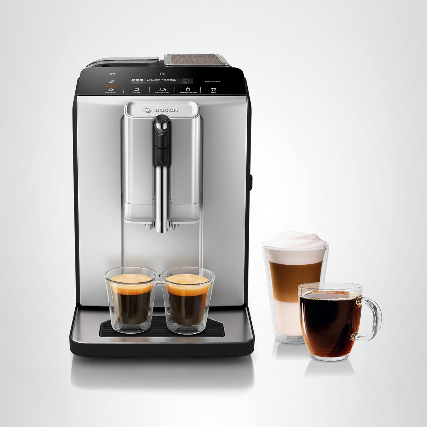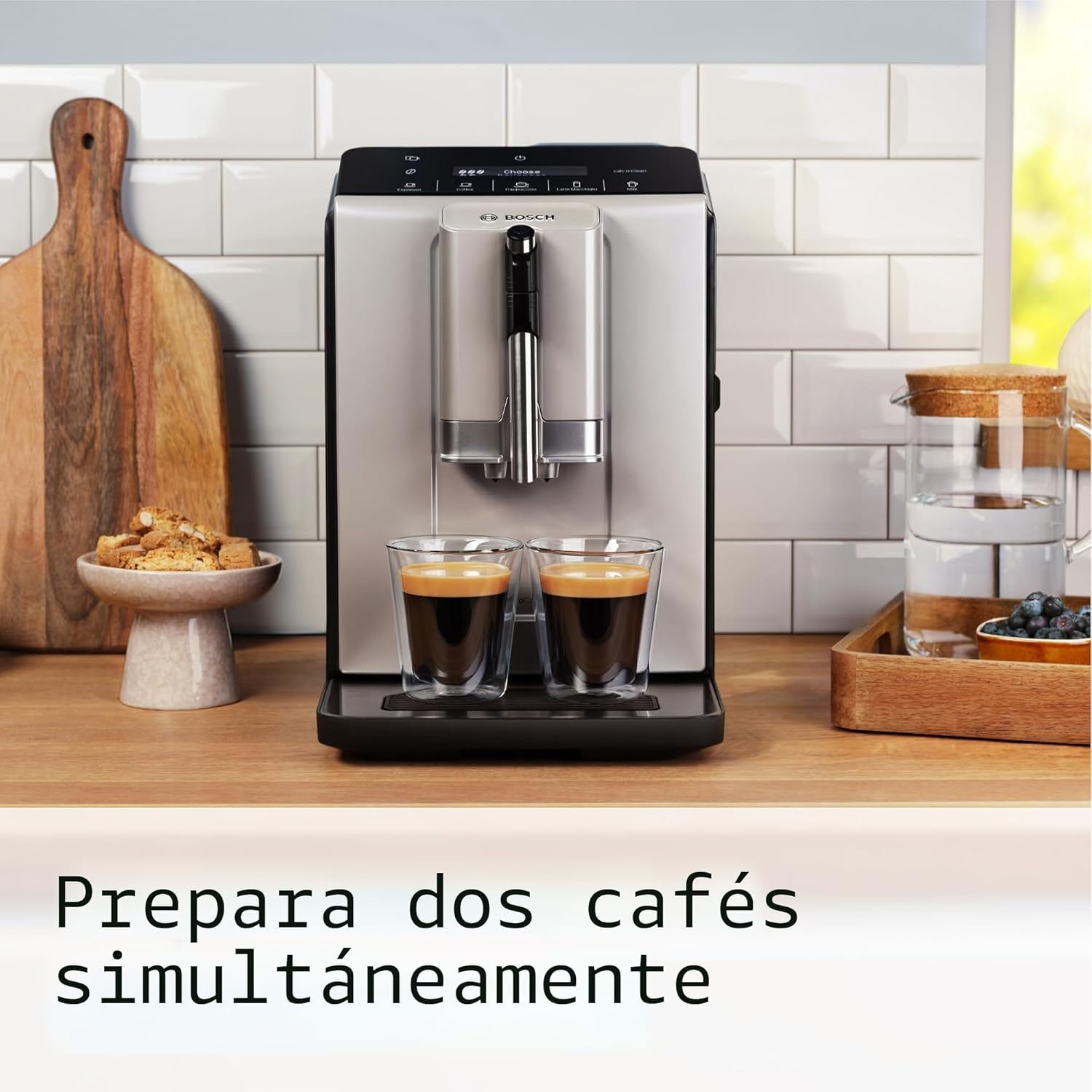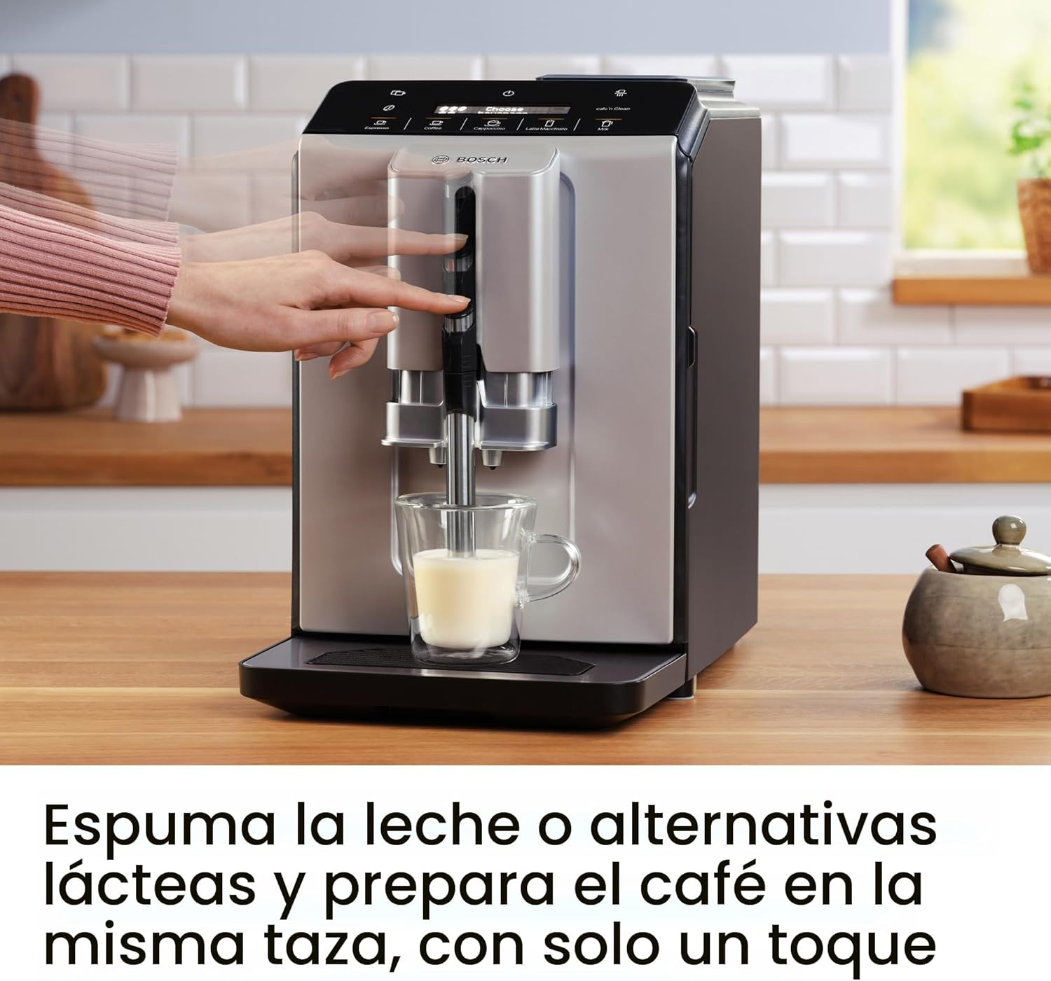La Bosch Serie 300 combina tecnología avanzada y facilidad de uso para preparar café y bebidas con leche de manera rápida y profesional. Su sistema OneTouch permite elaborar cappuccinos, lattes y cafés con leche con solo un botón, mientras que el espumador en taza asegura una espuma cremosa y consistente.