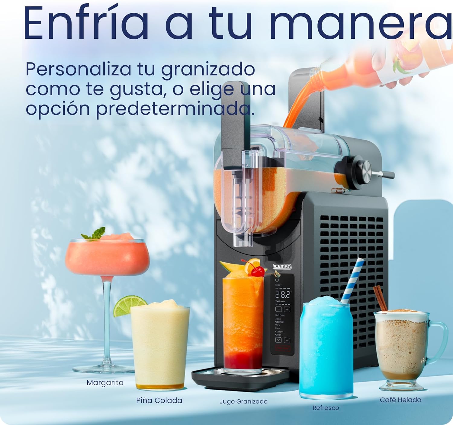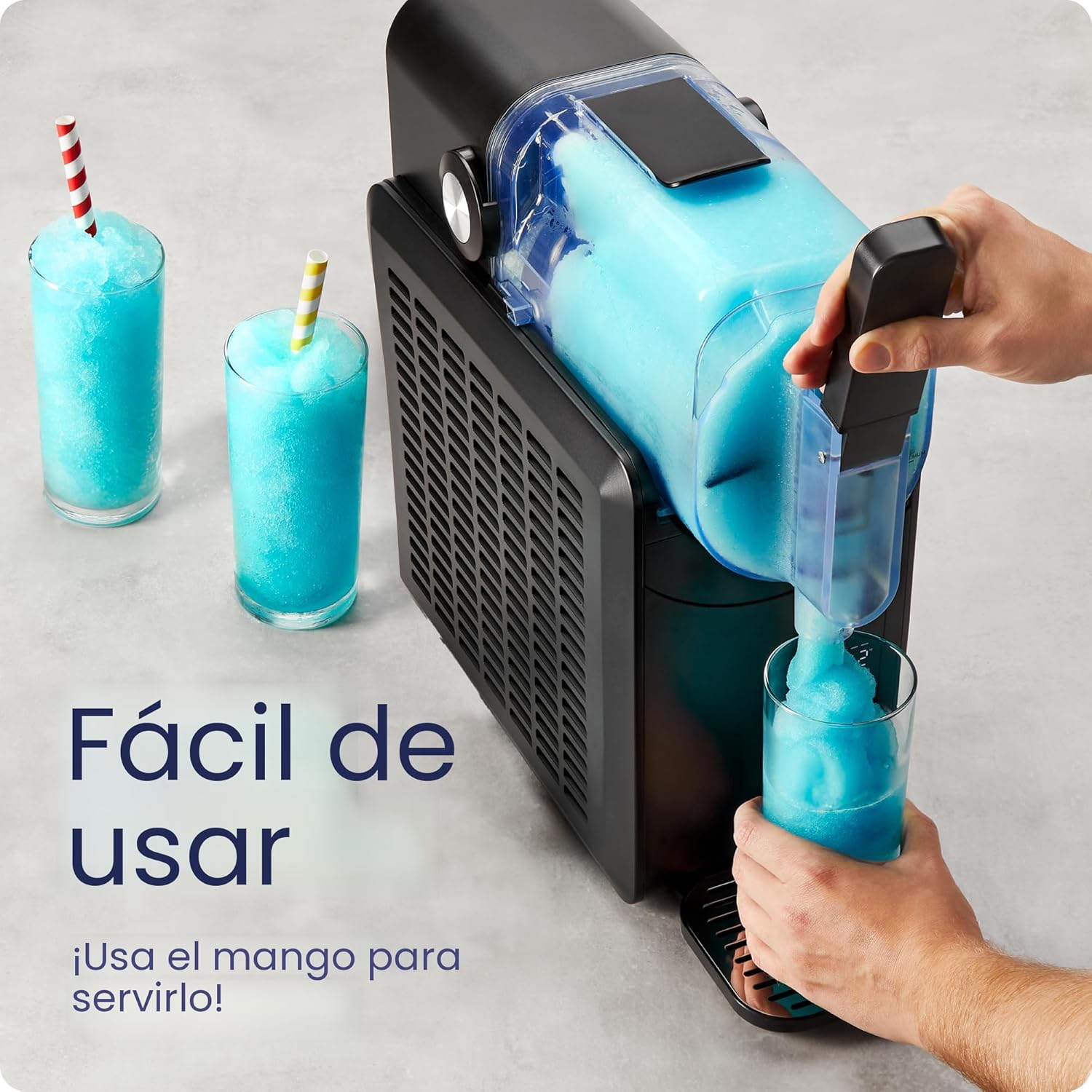 Dispone de 5 ajustes preestablecidos que ajustan automáticamente la textura del granizado. También incluye un modo personalizado para quienes desean un control total sobre la consistencia. Su palanca de dispensación fácil permite servir margaritas congeladas, bebidas heladas y granizados de forma limpia y precisa.