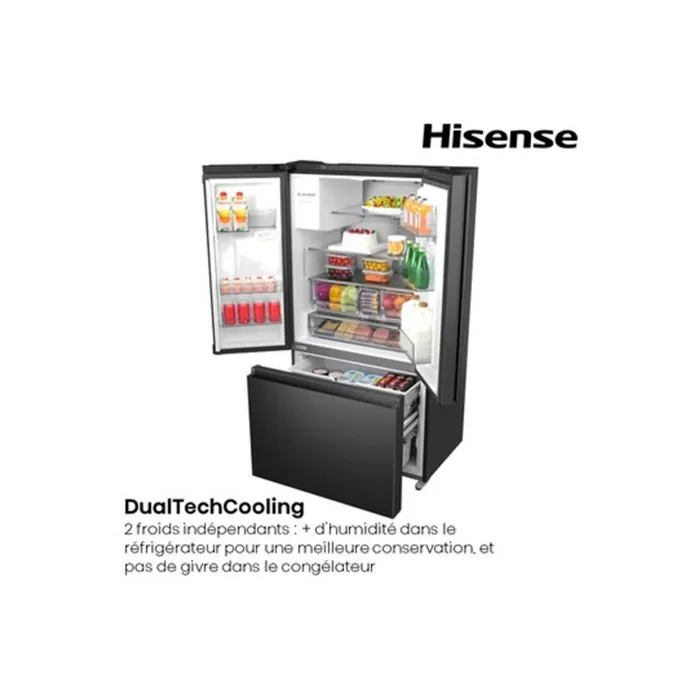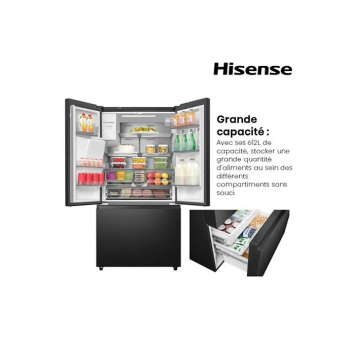 El frigorífico multipuerta HISENSE RF793N4SAFE es un electrodoméstico de gran capacidad con un diseño moderno. Ofrece un impresionante volumen total de , lo que lo hace ideal para familias grandes. Destaca por su tecnología Total No Frost (frio ventilado en ambos compartimentos), su bajo nivel de ruido de , y la integración de un distribuidor de agua, hielo y hielo picado (conectado a la red de agua). Su eficiencia es de Clase Energética E y tiene un atractivo acabado en color Inox Negro anti-huellas.